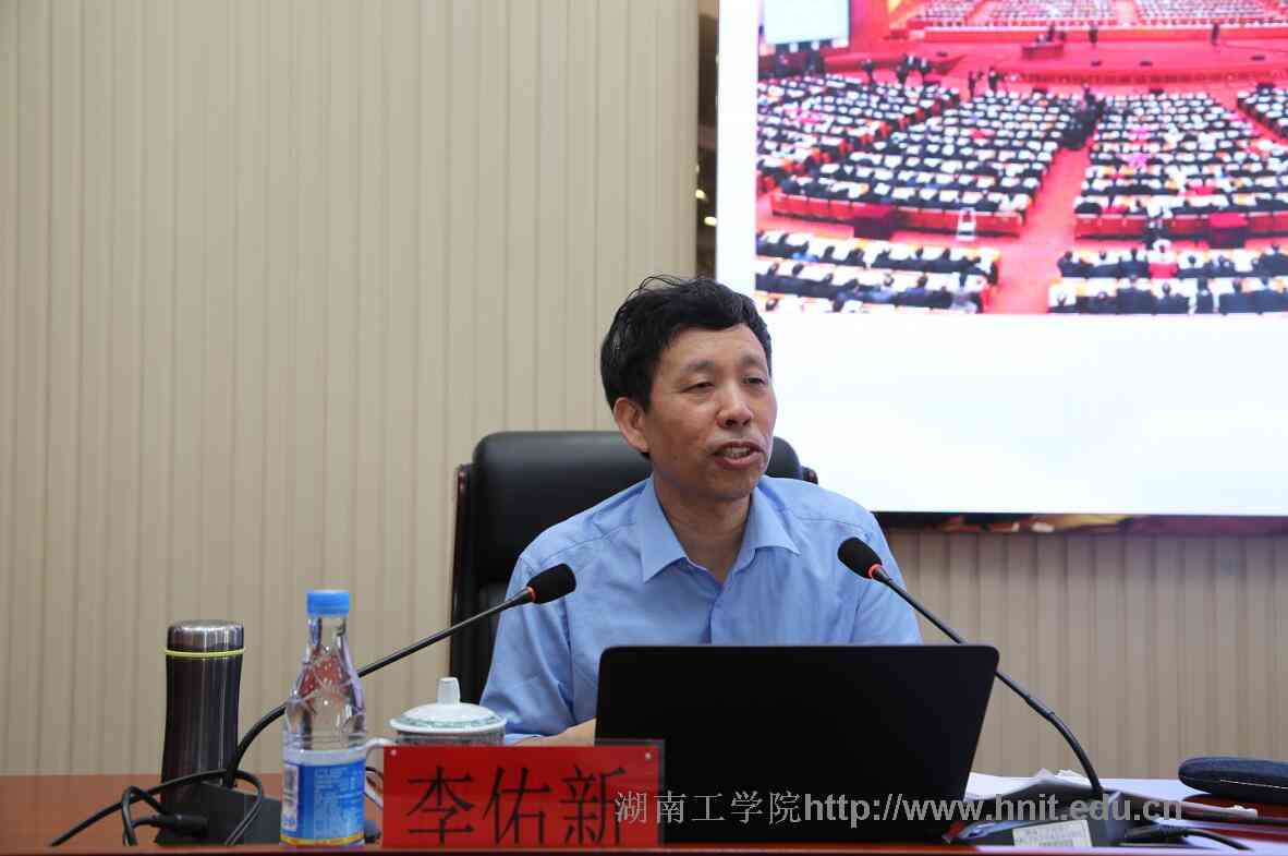 5月15日上午,我校在教学大楼12楼报告厅召开党委中心组(扩大)学习会,专题学习习近平新时代中国特色社会主义思想。教育部长江学者、百人宣讲团成员、湘潭大学马克思主义学院院长李佑新教授应邀来校作了题为《新时代,新思想,新征程——学习习近平新时代中国特色社会主义思想》的专题辅导报告。党委书记谢国保主持学习会,全体在校校领导参加了学习会。