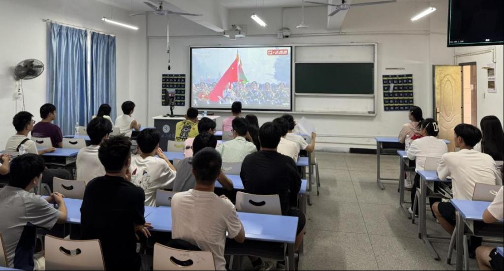 9月3日,学院党委组织全院师生,以多种形式集中观看纪念中国人民抗日战争暨世界反法西斯战争胜利阅兵式。看着检阅方阵整齐的步伐和国防装备武器逐个亮相,师生们的民族自信心和自豪感油然而生,进一步坚定理想信念,担当时代责任。