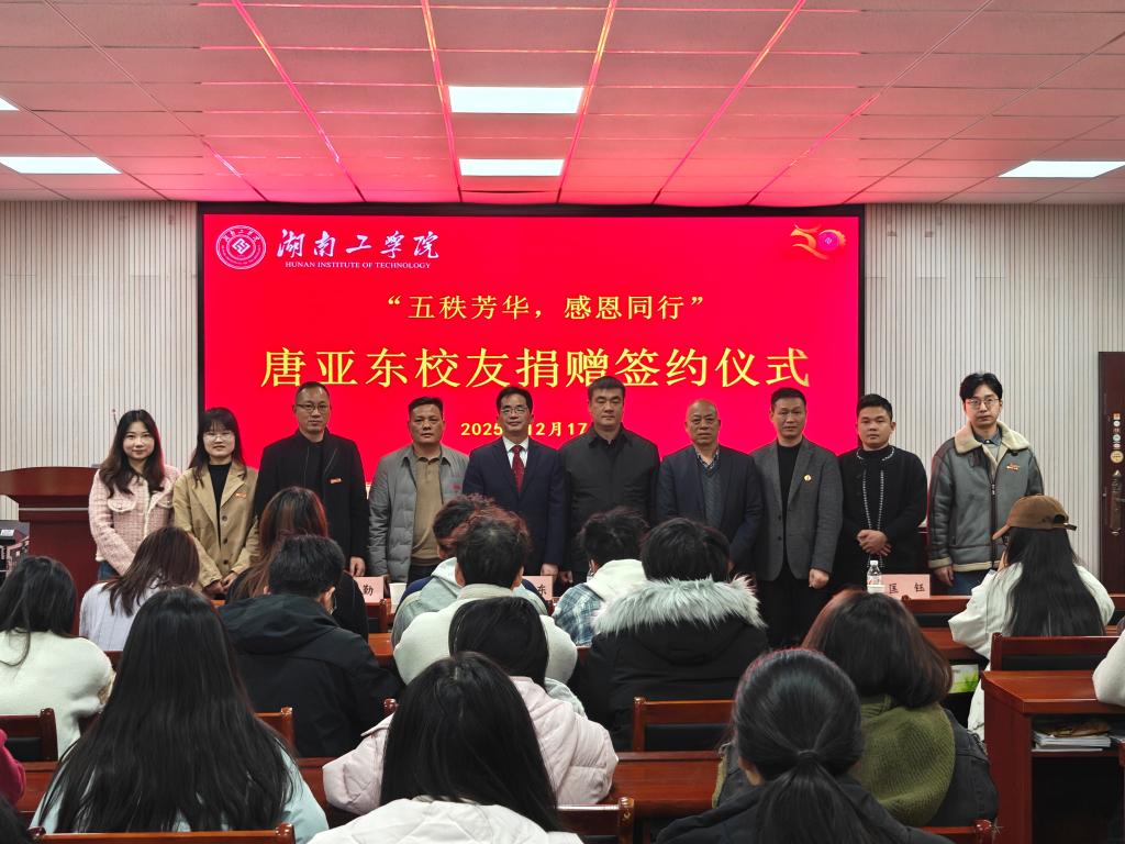 12月17日,2006级工商管理专业杰出校友、临武县君博房地产开发有限公司董事长唐亚东捐赠签约仪式在经管楼302举行。校党委委员袁勤、校友唐亚东及商学院、安全与管理工程学院、体育教学科研部的师生代表出席。仪式由商学院副院长李闯主持。